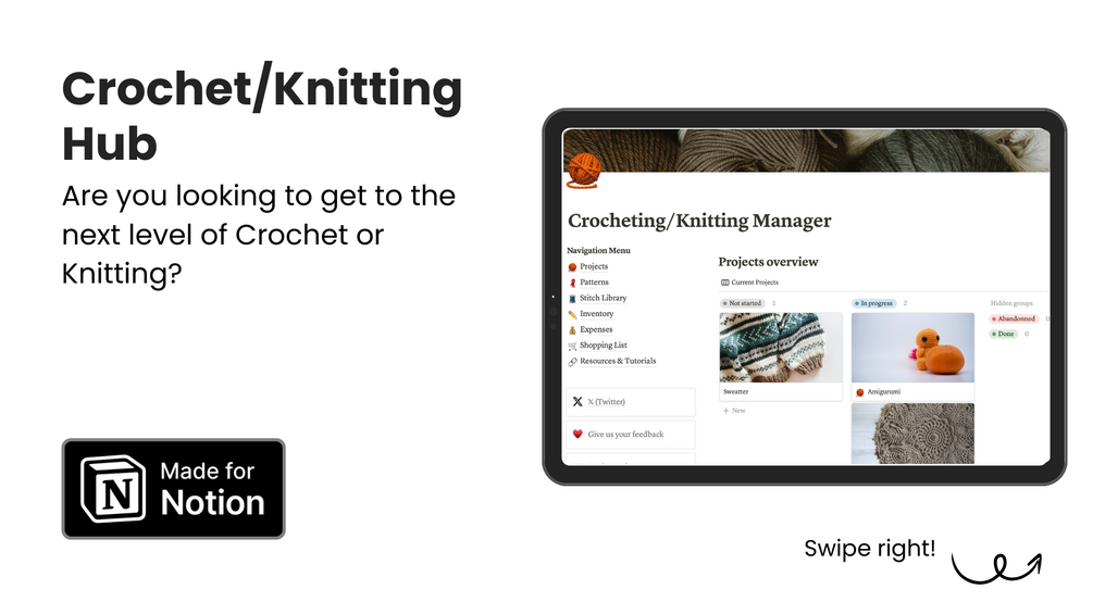 π©βπ« Whether you're crocheting a cozy blanket, knitting a stylish sweater, or exploring new techniques, our Notion template is your go-to companion for all things yarn-related.